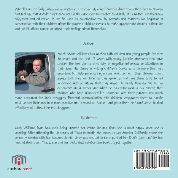 What'll I do if a Bully Bullies me is written in a rhyming style with creative illustrations that identify choices and feelings that a child might encounter if they are ever confronted by a bully. It is written for the child's enjoyment and education and can be used as an effective tool by parents and//or teachers for beginning a conversation with their children about the power a child possesses to make appropriate choices in their life and not let others control or affect their feelings about themselves.