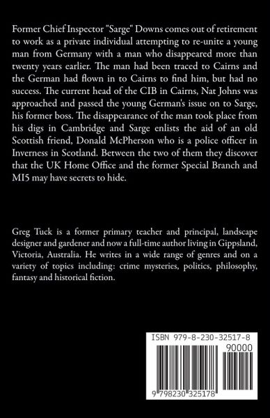 Former Chief Inspector "Sarge" Downs comes out of retirement to work as a private individual attempting to re-unite a young man from Germany with a man who disappeared more than twenty years earlier. The man had been traced to Cairns and the German had flown in to Cairns to find him, but had no success. The current head of the CIB in Cairns, Nat Johns was approached and passed the young German's issue on to Sarge, his former boss. The disappearance of the man took place from his digs in Cambridge and Sarge enlists the aid of an old Scottish friend, Donald McPherson who is a police officer in Inverness in Scotland. Between the two of them they discover that the UK Home Office and the former Special Branch and MI5 may have secrets to hide.