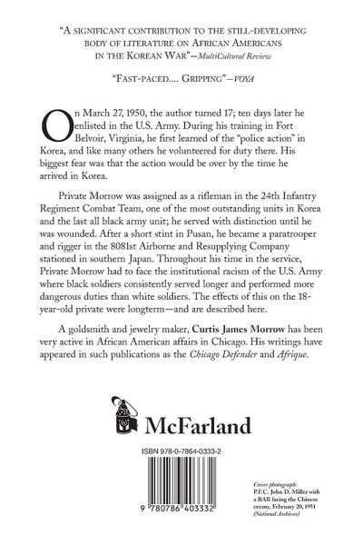 On March 27, 1950, the author turned 17; ten days later he enlisted in the U.S. Army. During his training in Fort Belvoir, Virginia, he first learned of the "police action" in Korea, and like many others he volunteered for duty there. His biggest fear was that the action would be over by the time he arrived in Korea. Private Morrow was assigned as a rifleman in the 24th Infantry Regiment Combat Team, one of the most outstanding units in Korea and the last all black army unit; he served with distinction until he was wounded. After a short stint in Pusan, he became a paratrooper and rigger in the 8081st Airborne and Resupplying Company stationed in southern Japan. Throughout his time in the service, Private Morrow had to face the institutional racism of the U.S. Army where black soldiers consistently served longer and performed more dangerous duties than white soldiers. The effects of this on the 18-year-old private were longterm--and are described here.