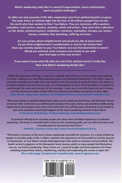 What's awakening really like in a world of supermarkets, messy relationships, work and global challenges? So often our only accounts of life after awakening come from spiritual teachers or gurus. This book shines an intimate light into the lives of 20 ordinary people from all over the world who have awoken to their True Nature. They are musicians, office workers, comedians, mail carriers, mentors, students, artists and writers. They share their reflections on life, death, spiritual teachers, meditation, emotions, motivation, therapy, sex, humor, money, creativity, God, parenting, suffering and more. Are you curious about enlightenment and would you like to know more? Do you think enlightenment is unobtainable or only for the chosen few? Have you recently awoken to your True Nature and now feel disoriented or alone? Would you welcome some company and context as you walk your first steps on this new terrain? If you want to know what life after the end of the spiritual search is really like, then read What's Awakening Really Like? ____________________________________________________________ "While the experience of living as vastness is certainly extraordinary, it is also simply extra ordinary. It is truly a waking up to something supremely basic and absolutely fundamental. This shift is open to everyone, including those who may never desire to don the mantle of spiritual teacher. This book is a wonderful window into just those people, an anthropological account of the Boundless as it wends its way through the nooks and crannies of the everyday. I invite you to read this book and see if it tunes you into the bread crumbs of that which has cleverly been hidden everywhere in plain sight." Ishtar Howell, Ishaya monk, gardener and meditation teacher, www.ascension-meditation.com "When your journey to spiritual awakening has taken you to a place you don't know, read this book. You are not alone in this. In the book, you will find good company in the open, honest, and sometimes disillusioning reports about what happens when parts or the whole idea of a self falls away. A book that is very needed to give some orientation about what happens on the way to awakening and how to deal with it." Dr Christiane Michelberger, Finding Awakening, www.findingawakening.com