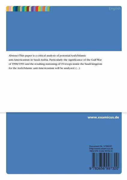 Thesis (M.A.) from the year 2009 in the subject American Studies - Culture and Applied Geography, grade: 2,3, Free University of Berlin (John F. Kennedy Institut), language: English, abstract: Abstract This paper is a critical analysis of potential Arab/Islamic anti-Americanism in Saudi Arabia. Particularly the significance of the Gulf War of 1990/1991 and the resulting stationing of US troops inside the Saudi kingdom for the Arab/Islamic anti-Americanism will be analyzed. Hereby, this project seeks to investigate whether the reactions to the American presence in Saudi Arabia and the broader Arab/Islamic region are of anti-American nature or whether they reveal other proprieties. With the help of various Arabic and American sources the research question is approached and compared from both sides. The inclusion of Arabic sources of Saudi opposition leaders allows this paper to examine which leitmotifs dominate the discourse on American soldiers in Saudi Arabia. Overall, four main reactions are identified and discussed with the means of a qualitative analysis: Foreigners and disbelievers in Saudi Arabia, opposition to the Saudi royal family, an exploitation of anti-Americanism, and a liberal movement. The resulting main themes lead to this paper's thesis that an anti-American characterization of the reactions to the American troop presence during the Gulf War is a questionable simplification of the situation.