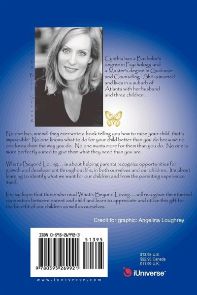 No one has, nor will they ever write a book telling you how to raise your child, that's impossible! No one knows what to do for your child better than you do because no one loves them the way you do. No one wants more for them than you do. No one is more perfectly suited to give them what they need than you are. Beyond Loving is about helping parents recognize opportunities for growth and development through out life, in both ourselves and our children. It s about learning to identify what we want for our children and from the parenting experience itself. It is my hope that those who read Beyond Loving will recognize the ethereal connection between parent and child and learn to appreciate and utilize this great gift for the benefit of our children as well as ourselves.