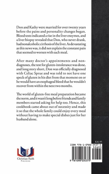 Don and Kathy were married for over twenty years before the pains and personality changes began. Blood tests indicated a rise in the liver enzymes, and a liver biopsy revealed that Don, who never drank, had nonalcoholic cirrhosis of the liver. As devastating as this news was, it did not explain the constant pain that seemed to worsen with each meal. After many doctor's appointments and non-diagnoses, the test for gluten-intolerance was done, and long story short, Don was officially diagnosed with Celiac Sprue and was told to not have one speck of gluten in his diet from that moment on or he would have an esophageal bleed that he wouldn't recover from within the next two months. The world of gluten-free meal preparation became the norm, and it wasn't long before friends and family members started asking for help too. Hence, this cookbook came about out of necessity and made it so that the whole family could enjoy every meal without having to make special dishes just for her husband alone.