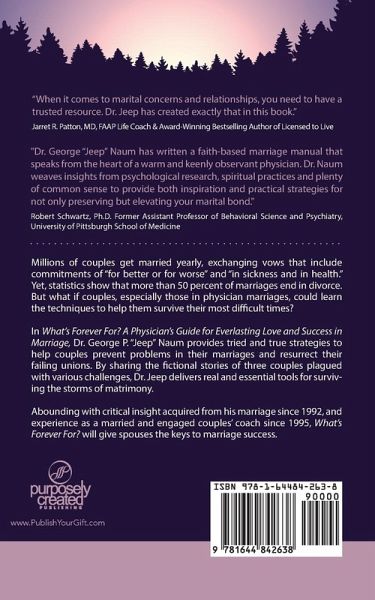 Millions of couples get married yearly, exchanging vows that include commitments of "for better or for worse" and "in sickness and in health." Yet, statistics show that more than 50 percent of marriages end in divorce. But what if couples, especially those in physician marriages, could learn the techniques to help them survive their most difficult times? In What's Forever For? A Physician's Guide for Everlasting Love and Success in Marriage, Dr. George P. "Jeep" Naum provides tried and true strategies to help couples prevent problems in their marriages and resurrect their failing unions. By sharing the fictional stories of three couples plagued with various challenges, Dr. Jeep delivers real and essential tools for surviving the storms of matrimony. Abounding with critical insight acquired from his marriage since 1992, and experience as a married and engaged couples' coach since 1995, What's Forever For? will give spouses the keys to marriage success.