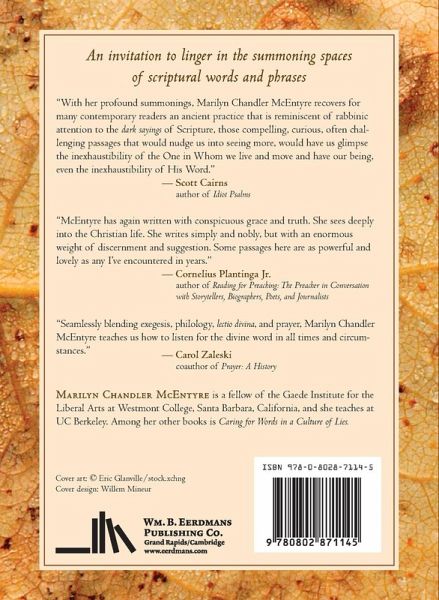 DESCRIPTION An invitation to seek the sacred space of Scripture's words and phrases Well-known biblical phrases — "in the fullness of time," "fearfully and wonderfully made," "in the beauty of holiness," and others — suggest and evoke and invite. In this book Marilyn Chandler McEntyre offers brief reflections on more than fifty such scriptural phrases that prompt readers to pay attention, to pause where we sense a beckoning. Some of these select phrases are devotional, some speculative, some whimsical, some edgy. McEntyre encourages us to see such "words within the Word" as invitations and, in doing so, to discover that they are places of divine encounter, epiphany, or unexpected guidance. The three sections of the book "Assurance," "Invitation," and "Surprise" — organize the reflections by tone as well as theme. Rich with eloquence, wisdom, and wonder, these reflections will lead readers to enter the sacred spaces of Scripture, play with possibilities, and connect the biblical word with the ordinary — and extraordinary — lives we've been given to live.