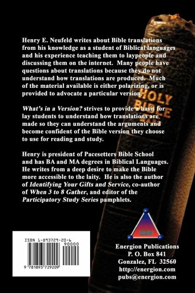 What goes into translating the Bible? How can a layperson choose a Bible translation and edition from the enormous number available, particularly in the English language. Author Henry E. Neufeld writes about Bible translations from his knowledge as a student of Biblical languages, and his experience teaching them to laypeople and discussing them on the internet. He addresses the questions that readers have, rather than just translation theory questions that might interest translators. Many people have questions about translations because they do not understand how translations are produced, so the views of translators are important. Much of the material available is either polarizing or is provided to advocate a particular version. Every version comes with publisher hype. What should the reader believe? What's in a Version? strives to provide a basis for lay students to understand how translations are made so they can understand the arguments and become confident of the Bible version they choose to use for reading and study. Ultimately, the author's aim is to help readers find the version they will read, consistent with his belief that it doesn't matter how accurate an unread Bible is. This book is aimed at a lay audience, but can also be helpful for Sunday School teachers and pastors who want to communicate biblical material effectively with congregations, classes, and small groups.