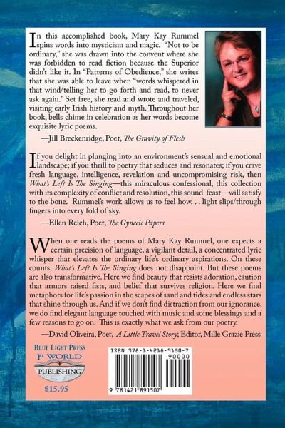 In this accomplished book, Mary Kay Rummel spins words into mysticism and magic. "Not to be ordinary," she was drawn into the convent where she was forbidden to read fiction because the Superior didn't like it. In "Patterns of Obedience," she writes that she was able to leave when "words whispered in that wind/telling her to go forth and read, to never ask again." Set free, she read and wrote and traveled, visiting early Irish history and myth. Throughout her book, bells chime in celebration as her words become exquisite lyric poems. -Jill Breckenridge, Poet, The Gravity of Flesh If you delight in plunging into an environment's sensual and emotional landscape; if you thrill to poetry that seduces and resonates; if you crave fresh language, intelligence, revelation and uncompromising risk, then What's Left Is The Singing-this miraculous confessional, this collection with its complexity of conflict and resolution, this sound-feast-will satisfy to the bone. Rummel's work allows us to feel how. . . light slips/through fingers into every fold of sky. -Ellen Reich, Poet, The Gynecic Papers When one reads the poems of Mary Kay Rummel, one expects a certain precision of language, a vigilant detail, a concentrated lyric whisper that elevates the ordinary life's ordinary aspirations. On these counts, What's Left Is The Singing does not disappoint. But these poems are also transformative. Here we find beauty that resists adoration, caution that armors raised fists, and belief that survives religion. Here we find metaphors for life's passion in the scapes of sand and tides and endless stars that shine through us. And if we don't find distraction from our ignorance, we do find elegant language touched with music and some blessings and a few reasons to go on. This is exactly what we ask from our poetry. -David Oliveira, Poet, A Little Travel Story; Editor, Mille Grazie Press