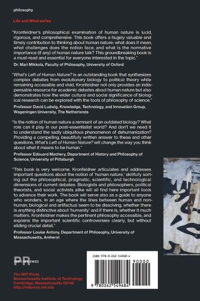A philosophical account of human nature that defends the concept against dehumanization, Darwinian, and developmentalist challenges. Human nature has always been a foundational issue for philosophy. What does it mean to have a human nature? Is the concept the relic of a bygone age? What is the use of such a concept? What are the epistemic and ontological commitments people make when they use the concept? In What's Left of Human Nature? Maria Kronfeldner offers a philosophical account of human nature that defends the concept against contemporary criticism. In particular, she takes on challenges related to social misuse of the concept that dehumanizes those regarded as lacking human nature (the dehumanization challenge); the conflict between Darwinian thinking and essentialist concepts of human nature (the Darwinian challenge); and the consensus that evolution, heredity, and ontogenetic development result from nurture and nature. After answering each of these challenges, Kronfeldner presents a revisionist account of human nature that minimizes dehumanization and does not fall back on outdated biological ideas. Her account is post-essentialist because it eliminates the concept of an essence of being human; pluralist in that it argues that there are different things in the world that correspond to three different post-essentialist concepts of human nature; and interactive because it understands nature and nurture as interacting at the developmental, epigenetic, and evolutionary levels. On the basis of this, she introduces a dialectical concept of an ever-changing and “looping” human nature. Finally, noting the essentially contested character of the concept and the ambiguity and redundancy of the terminology, she wonders if we should simply eliminate the term “human nature” altogether.