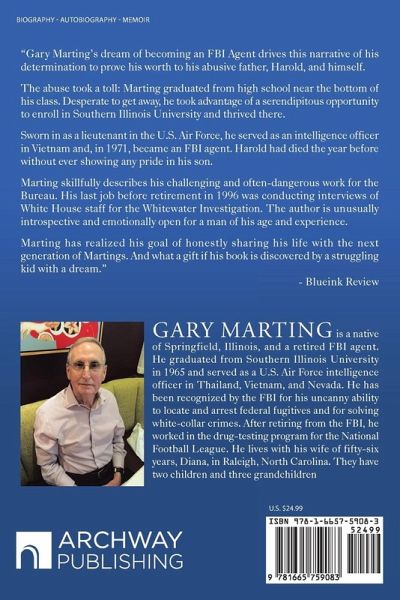 "Gary Marting's dream of becoming an FBI Agent drives this narrative of his determination to prove his worth to his abusive father, Harold, and himself. The abuse took a toll: Marting graduated from high school near the bottom of his class. Desperate to get away, he took advantage of a serendipitous opportunity to enroll in Southern Illinois University and thrived there. Sworn in as a lieutenant in the U.S. Air Force, he served as an intelligence officer in Vietnam and, in 1971, became an FBI agent. Harold had died the year before without ever showing any pride in his son. Marting skillfully describes his challenging and often-dangerous work for the Bureau. His last job before retirement in 1996 was conducting interviews of White House staff for the Whitewater Investigation. The author is unusually introspective and emotionally open for a man of his age and experience. Marting has realized his goal of honestly sharing his life with the next generation of Martings. And what a gift if his book is discovered by a struggling kid with a dream." - Blueink Review