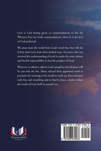 Love is God having given us commandments to live by. Whoever lives by God's commandments, there in is the love of God perfected. We must warn the world from God's word that they will die if they don't turn from their wicked ways. Everyone who has received the understanding of truth is under the same solemn and fearful responsibility as was the prophet of Israel. Whoever is called to deliver God's prophecy but declines will be cast into the fire. Many refused their appointed work to proclaim the warning to the world to work out their salvation with fear and trembling and to find in Jesus a shelter before the wrath of God shall be poured out.