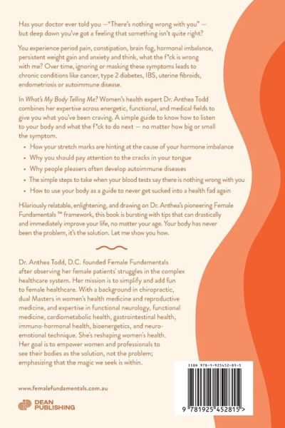 Has your doctor ever told you -"There's nothing wrong with you" -but deep down you've got a feeling that something isn't quite right? You experience period pain, constipation, brain fog, hormonal imbalance, persistent weight gain and anxiety and think, what the f*ck is wrong with me? Over time, ignoring or masking these symptoms leads to chronic conditions like cancer, type 2 diabetes, IBS, uterine fibroids, endometriosis or autoimmune disease. In What's My Body Telling Me? Women's health expert Dr. Anthea Todd combines her expertise across energetic, functional, and medical fields to give you what you've been craving. A simple guide to know how to listen to your body and what the f*ck to do next - no matter how big or small the symptom. How your stretch marks are hinting at the cause of your hormone imbalance Why you should pay attention to the cracks in your tongue Why people pleasers often develop autoimmune diseases The simple steps to take when your blood tests say there is nothing wrong with you How to use your body as a guide to never get sucked into a health fad again Hilariously relatable, enlightening, and drawing on Dr. Anthea's pioneering Female Fundamentals(TM) framework, this book is bursting with tips that can drastically and immediately improve your life, no matter your age. Your body has never been the problem, it's the solution. Let me show you how. Dr. Anthea Todd, D.C. founded Female Fundamentals(TM) after observing her female patients' struggles in the complex healthcare system. With a background in chiropractic, a dual master's in women's health medicine and reproductive medicine, and expertise in functional medicine, functional neurology, cardiometabolic health, gastrointestinal health, immune-hormonal health, bioenergetics, and neuro-emotional technique, she's reshaping women's health. Her goal is to empower women to see their bodies as the solution, not the problem, emphasizing that the magic we seek is within. www.femalefundamentals.com.au