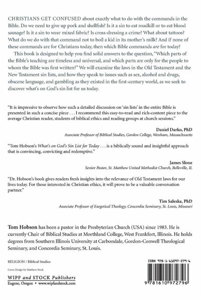 Christians get confused about exactly what to do with the commands in the Bible. Do we need to give up pork and shellfish? Is it a sin to eat roadkill or to eat blood sausage? Is it a sin to wear mixed fabric? Is cross-dressing a crime? What about tattoos? What do we do with that command not to boil a kid in its mother's milk? And if none of these commands are for Christians today, then which Bible commands are for today? This book is designed to help you find solid answers to the question, ""Which parts of the Bible's teaching are timeless and universal, and which parts are only for the people to whom the Bible was first written?"" We will examine the laws in the Old Testament and the New Testament sin lists, and how they speak to issues such as sex, alcohol and drugs, obscene language, and gambling as they existed in the first-century world, as we seek to discover what's on God's sin list for us today.