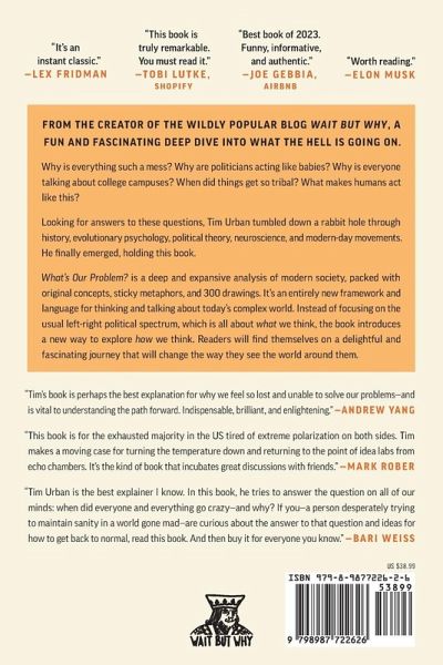 From the creator of the wildly popular blog Wait But Why, a fun and fascinating deep dive into what the hell is going on in our strange, unprecedented modern times. Between 2013 and 2016, Tim Urban became one of the world's most popular bloggers, writing dozens of viral, long-form articles about everything from AI to colonizing Mars to procrastination. Then, he turned his attention to a new topic: the society around him. Why was everything such a mess? Why was everyone acting like such a baby? When did things get so tribal? Why do humans do this stuff? This massive topic sent Tim tumbling down his deepest rabbit hole yet, through mountains of history, evolutionary psychology, political theory, neuroscience, and modern-day political movements, as he tried to figure out the answer to a simple question: What's our problem? Six years later, he emerged from the hole holding this book. What's Our Problem? is a deep and expansive analysis of our modern times, in the classic style of Wait But Why, packed with original concepts, sticky metaphors, and 300 drawings. The book provides an entirely new framework and language for thinking and talking about today's complex world. Instead of focusing on the usual left-center-right horizontal political axis, which is all about what we think, the book introduces a vertical axis that explores how we think, as individuals and as groups. Readers will find themselves on a delightful and fascinating journey that will ultimately change the way they see the world around them. Anyway he wanted to say a lot more about all of this but there was a word limit on this book description so just go read the book. (Note: There are over 100 pages of endnotes for this book, so to keep costs for the paperback as low as possible, we've put those pages online. Endnotes are printed in full in the hardcover edition.)