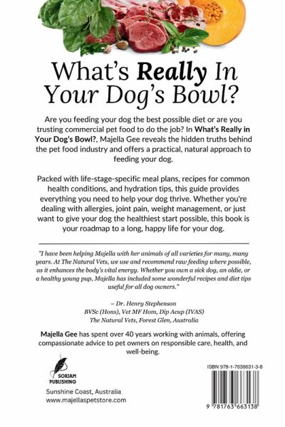 Is your dog eating what nature intended? In this guide, Majella Gee, a lifelong animal advocate and pet care expert, uncovers the truth behind commercial dog food and the harm it can cause. Filled with preservatives, fillers, and synthetic ingredients, most commercial dog food isn't designed with your dog's long-term health in mind. This book offers a simple solution: feeding your dog a natural, whole-food diet. With decades of experience working with pets and wildlife, Majella provides practical, easy-to-follow advice on how to transition your dog to a healthier, more natural diet that supports their vitality at every stage of life. Inside, you'll find: Life Stage-Specific Diet Plans: Nutritional guidance for puppies, adults, and seniors. Recipes for Health Conditions: Meals to support joint health, skin allergies, weight management, and more. The 30-Day Transition Challenge: A step-by-step guide to switching your dog's diet. Bonus Treat Recipes: Fun, nutritious snacks and treats for every occasion. Hydration Tips and Vet Bill Savings: Simple ways to keep your dog healthy and save on vet visits. Whether your dog is young or old, healthy, or dealing with specific issues, What's Really in Your Dog's Bowl? provides the tools you need to make better nutritional choices and ensure your dog lives a long, happy, and healthy life.