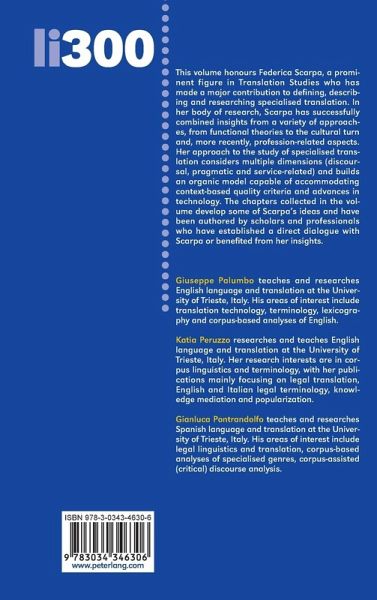 This volume honours Federica Scarpa, a prominent figure in Translation Studies who has made a major contribution to defining, describing and researching specialised translation. In her body of research, Scarpa has successfully combined insights from a variety of approaches, from functional theories to the cultural turn and, more recently, profession-related aspects. Her approach to the study of specialised translation considers multiple dimensions (discoursal, pragmatic and service-related) and builds an organic model capable of accommodating context-based quality criteria and advances in technology. The chapters collected in the volume develop some of Scarpa's ideas and have been authored by scholars and professionals who have established a direct dialogue with Scarpa or benefited from her insights.
