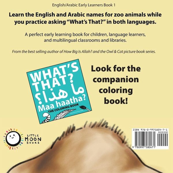 Learn the English and Arabic names for zoo animals while you practice asking "What's That?" in both languages. A perfect early learning book for children, language learners, and multilingual classrooms and libraries. Little Moon Books' English/Arabic Early Learners books provide bold, bright colors, original illustrations, English, Arabic, and Transliteration, to make reading and learning fun and promote bilingualism in every family! From the best selling author of How Big Is Allah? and the Owl & Cat picture book series, Emma Apple.