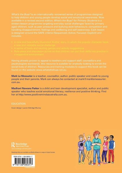 What's the Buzz? is an internationally renowned series of programmes designed to help children and young people develop social and emotional awareness. Now available in a revised second edition, What's the Buzz for Primary Students is a sixteen-lesson programme targeting everyday social challenges faced by primary aged children, such as peer pressure and bullying style behaviours; competition and handling disappointment; feelings and wellbeing and self-awareness. Each lesson is designed around the SAFE criteria (Sequenced; Active; Focused; Explicit) and includes: A new and beautifully illustrated 'Archie' story, in which the popular character faces a new and relatable social challenge A series of lively and exciting games and activity suggestions Role-plays and discussion points so that children can put their skills into practice in a supportive environment Having already proven to appeal to teachers and support staff, counsellors and psychologists worldwide, this resource is suitable for anybody looking to enrich the social lives of children. Resources and training modules to support this book can be found on the website www.whatsthebuzz.net.au.
