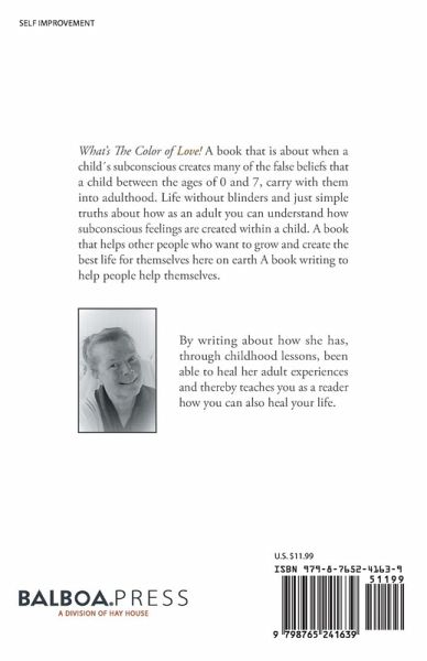 What's The Color of Love! A book that is about when a child¿s subconscious creates many of the false beliefs that a child between the ages of 0 and 7, carry with them into adulthood. Life without blinders and just simple truths about how as an adult you can understand how subconscious feelings are created within a child. A book that helps other people who want to grow and create the best life for themselves here on earth A book writing to help people help themselves.