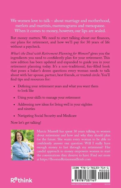 We women love to talk - about marriage and motherhood, merlots and martinis, mammograms and menopause. When it comes to money, however, our lips are sealed. But money matters. We need to start talking about our finances, our plans for retirement, and how we'll pay for 30 years of life without a paycheck. What's the Deal with Retirement Planning for Women? gives you the ingredients you need to confidently plan for your retirement. This new edition has been updated and expanded to guide you in your retirement planning today. It's a non-traditional, fun-filled book that poses a baker's dozen questions every woman needs to talk about with her spouse, partner, best friends, or trusted circle. You'll find tips and resources for: Defining your retirement years and what you want them to look like Using your skills to manage your retirement Addressing new ideas for living well in your eighties and nineties Navigating Social Security and Medicare Now let's get talking!