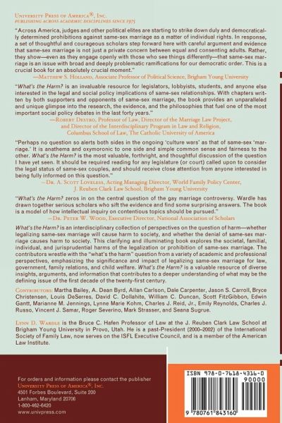Chapter 1 Acknowledgements Chapter 2 "What's The Harm?" And Why It Matters Part 3 PART I: DOES LEGALIZING SAME-SEX MARRIAGE HARM FAMILIES AND CHILDREARING? Chapter 4 1: Conjugal Marriage Fosters Healthy Human and Societal Development Chapter 5 2: The Alleged Harms of Recognizing Same-Sex Marriage Chapter 6 3: "Who's My Daddy?" How the Legalization of Same-Sex Partnerships Would Further the Rise of Ambiguous Fatherhood in America Chapter 7 4: Unintended Consequences: The Flaws in "It Doesn't Affect Anyone But Us" Argument in Favor of Legalizing Same-Sex Marriage Chapter 8 5: What's the Harm to Women and Children? A Prospective Analysis Chapter 9 6: Same-Sex Marriage and the Rights of the Child Part 10 PART II: DOES LEGALIZING SAME-SEX MARRIAGE HARM RESPONSIBLE SEXUAL BEHAVIOR AND PROCREATION? Chapter 11 7: The Principles of Justice in Procreative Affiliations Chapter 12 8: Dwelling Among Us Chapter 13 9: Meaning, Morality, and Sexual Attraction: Questioning the Reductive and Deterministic Assumptions of Biologism and Social Constructionism Chapter 14 10: Sexual Virtue, Sexual Vice, and the Requirements of the Good Society: Lessons from Ancient Rome Part 15 PART III:DOES LEGALIZING SAME-SEX MARRIAGE HARM THE RELATIONSHIP AND MEANING OF MARRIAGE? Chapter 16 11: The Morality of Marriage and the Transformative Power of Inclusion Chapter 17 12: The Case for Treating Same-Sex Marriage As A Human Right and the Harm of Denying Human Dignity Chapter 18 13: Equality or Ideology? Same-Sex Unions in Scandinavia Chapter 19 14: Same-Sex Marriage As Verbacide: Reaffirming the Linguistic and Cultural Heritage that Once Made "Marriage" a Vibrant Word of Substance and Hope Part 20 PART IV:DOES LEGALIZING SAME-SEX MARRIAGE HARM BASIC HUMAN FREEDOMS AND INSTITUTIONS? Chapter 21 15: The Erosion of Marriage: A Pyrrhic Victory? Chapter 22 16: The Unconservative Harms of Conservative Opposition to Gay Marriage Chapter 23 17: Or for Poorer? How Same-Sex Marriage Threatens Religious Liberty Chapter 24 18: Same-Sex Marriage and Public School Curricula: Reflections on Preserving the Rights of Parents to Direct the Education of their Children Chapter 25 19: Redefinition of Marriage and the Rule of Law