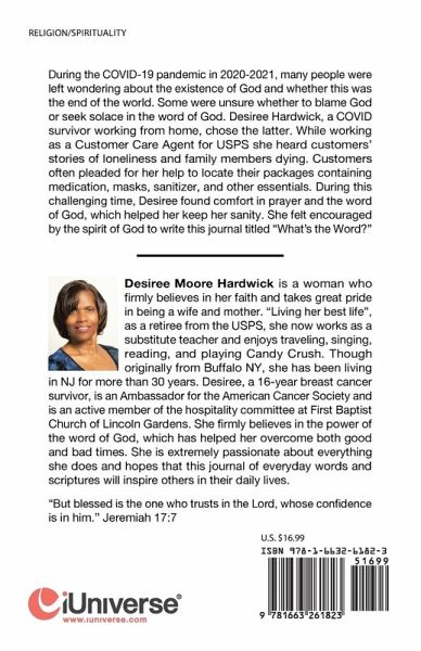 During the COVID-19 pandemic in 2020-2021, many people were left wondering about the existence of God and whether this was the end of the world. Some were unsure whether to blame God or seek solace in the word of God. Desiree Hardwick, a COVID survivor working from home, chose the latter. While working as a Customer Care Agent for USPS she heard customers' stories of loneliness and family members dying. Customers often pleaded for her help to locate their packages containing medication, masks, sanitizer, and other essentials. During this challenging time, Desiree found comfort in prayer and the word of God, which helped her keep her sanity. She felt encouraged by the spirit of God to write this journal titled "What's the Word?"