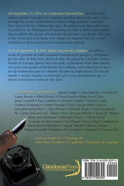 Special Spanish-English Bilingual Edition ¿ Edición especial inglés-castellano On September 11, 2012, on Catalonia's National Day, 1.5 million people from all over Catalonia marched peacefully and joyfully through the streets of Barcelona, behind a single placard: Catalonia: New State in Europe. Fifteen days later, President Artur Mas called snap elections for the Parliament of Catalonia, in order to hold a referendum that would let the people of Catalonia decide their own future. The rest of the world and even Spain were caught by surprise, but the events unfolding in Barcelona have been a long time coming.¿¿ In this new book, 35 experts explore Catalonia's history, economics, politics, language, and culture, in order to explain to the rest of the world the fascinating story behind the march, the new legislature, and the upcoming vote on whether Catalonia will become the next new state in Europe.¿¿ ----- El 11 de septiembre de 2012, Diada Nacional de Cataluña, un millón y medio de personas de toda Cataluña se manifestaron pacífica y felizmente por las calles de Barcelona, detrás de una sola pancarta: Cataluña: Nuevo Estado de Europa. Quince días más tarde, el presidente Artur Mas convocó elecciones anticipadas al Parlamento de Cataluña, con la intención de hacer un referéndum para que los catalanes decidan su propio futuro. El resto del mundo, e incluso España, se sorprendió, pero los acontecimientos que se dieron en Barcelona vienen de muy lejos. En este nuevo libro, 35 expertos exploran la historia, economía, política, lengua y cultura de Cataluña para poder explicar al resto del mundo los antecedentes fascinantes que hay detrás de la manifestación, la nueva legislatura, y el referéndum que se celebrará próximamente para saber si Cataluña será un nuevo estado de Europa. --- With articles by / Con artículos de: Ignasi Aragay ¿ Laia Balcells ¿ Germà Bel ¿ Laura Borràs ¿ Alfred Bosch ¿ Núria Bosch ¿ Roger Buch i Ros ¿ Joan Canadell ¿ Pau Canaleta ¿ Salvador Cardús ¿ Muriel Casals ¿ Andreu Domingo ¿ Carme Forcadell Lluís ¿ Josep Maria Ganyet ¿ Salvador Garcia-Ruiz ¿ Àlex Hinojo ¿ Edward Hugh ¿ Oriol Junqueras ¿ M. Carme Junyent ¿ J.C. Major ¿ Pere Mayans Balcells ¿ Josep M. Muñoz ¿ Mary Ann Newman ¿ Elisenda Paluzie ¿ Vicent Partal Cristina Perales-García ¿ Eva Piquer ¿ Enric Pujol Casademont ¿ Marta Rovira-Martínez ¿ Vicent Sanchis ¿ Xavier Solano ¿ Miquel Strubell ¿ Matthew Tree ¿ Ramon Tremosa ¿ F. Xavier Vila