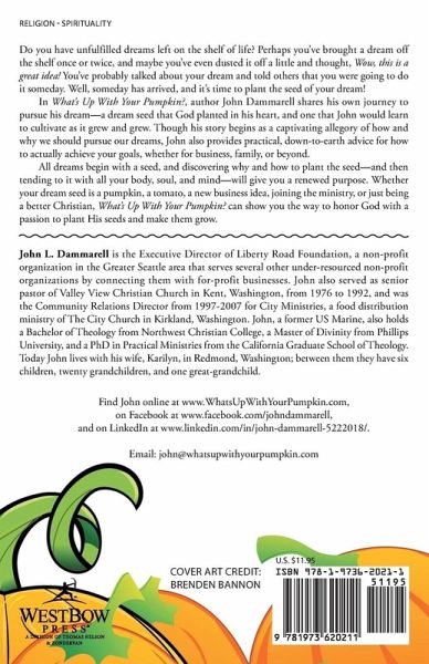 Do you have unfulfilled dreams left on the shelf of life? Perhaps youve brought a dream off the shelf once or twice, and maybe youve even dusted it off a little and thought, Wow, this is a great idea! Youve probably talked about your dream and told others that you were going to do it someday. Well, someday has arrived, and its time to plant the seed of your dream! In Whats Up With Your Pumpkin?, author John Dammarell shares his own journey to pursue his dreama dream seed that God planted in his heart, and one that John would learn to cultivate as it grew and grew. Though his story begins as a captivating allegory of how and why we should pursue our dreams, John also provides practical, down-to-earth advice for how to actually achieve your goals, whether for business, family, or beyond. All dreams begin with a seed, and discovering why and how to plant the seedand then tending to it with all your body, soul, and mindwill give you a renewed purpose. Whether your dream seed is a pumpkin, a tomato, a new business idea, joining the ministry, or just being a better Christian, Whats Up With Your Pumpkin? can show you the way to honor God with a passion to plant His seeds and make them grow.