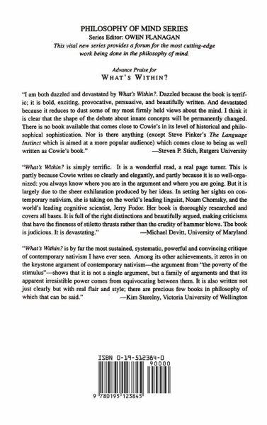 This powerfully iconoclastic book reconsiders the influential nativist position toward the mind. Nativists assert that some concepts, beliefs, or capacities are innate or inborn: native to the mind rather than acquired. Fiona Cowie argues that this view is mistaken, demonstrating that nativism is an unstable amalgam of two quite different--and probably inconsistent--theses about the mind. Unlike empiricists, who postulate domain-neutral learning strategies, nativists insist that some learning tasks require special kinds of skills, and that these skills are hard-wired into our brains at birth. This "faculties hypothesis" finds its modern expression in the views of Noam Chomsky. Cowie, marshaling recent empirical evidence from developmental psychology, psycholinguistics, computer science, and linguistics, provides a crisp and timely critique of Chomsky's nativism and in its place defends a moderately nativist approach to language acquisition. She also takes on the view articulated by nativists such as philosopher Jerry Fodor that learning, particularly concept acquisition, is a mysterious process. Cowie challenges this explanatory pessimism, and argues convincingly that concept acquisition is psychologically explicable. What's Within? is a clear and provocative milestone in the study of the human mind.
