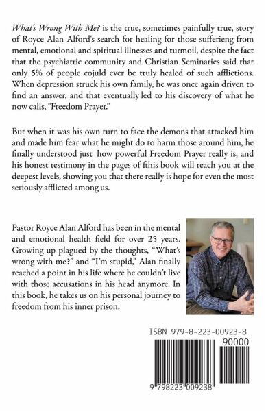 What's Wrong With Me? is the true, sometimes painfully true, story of Royce Alan Alford's search for healing for those sufferieng from mental, emotional and spiritual illnesses and turmoil, despite the fact that the psychiatric community and Christian Seminaries said that only 5% of people cojuld ever be truly healed of such afflictions. When depression struck his own family, he was once again driven to find an answer, and that eventually led to his discovery of what he now calls, "Freedom Prayer." But when it was his own turn to face the demons that attacked him and made him fear what he might do to harm those around him, he finally understood just how powerful Freedom Prayer really is, and his honest testimony in the pages of fthis book will reach you at the deepest levels, showing you that there really is hope for even the most seriously afflicted among us.