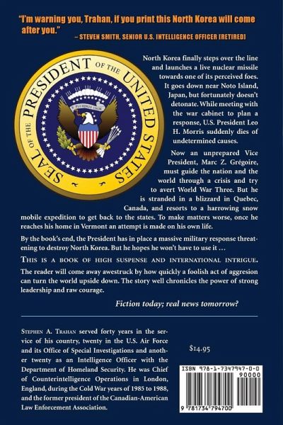 North Korea finally steps over the line and launches a live nuclear missile towards one of its perceived foes. It goes down near Noto Island, Japan, but fortunately doesn't detonate. While meeting with the war cabinet to plan a response, U.S. President Leo H. Morris suddenly dies of undetermined causes. Now an unprepared Vice President, Marc Z. Grégoire, must guide the nation and the world through a crisis and try to avert World War Three. But he is stranded in a blizzard in Quebec, Canada, and resorts to a harrowing snowmobile expedition to get back to the states. To make matters worse, once he reaches his home in Vermont an attempt is made on his own life. By the book's end, the President has in place a massive military response threatening to destroy North Korea. But he hopes he won't have to use it ... This is a book of high suspense and international intrigue. The reader will come away awestruck by how quickly a foolish act of aggresion can turn the world upside down. The story well chronicles the power of strong leadership and raw courage. Fiction today; real news tomorrow?