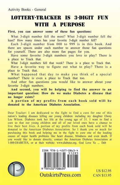 Lottery-Tracker is 3-digit fun with a purpose First, you can answer some of these fun questions: What 3-digit number fell the most? What 3-digit number fell the least? How many times has your favorite 3-digit number fell? Each 3-digit number from 000 to 999 is in this book. And there are spaces under each number to answer those fun questions for yourself. There are also more fun pages for you. Have some favorite 3-digit numbers you love to play? There is a place to Track that. What 3-digit numbers fell that week? There is a place to Track that. Have a favorite way to figure out what to play? There is a place to Track that. What happened that day to make you think of a special number? There is even a place to Track that too. And other fun questions you would like to answer about your favorite 3-digit numbers. And second, you will be helping to find the answer to an important question: How do we make Diabetes a disease that no longer exists? A portion of my profits from each book sold will be donated to the American Diabetes Association.