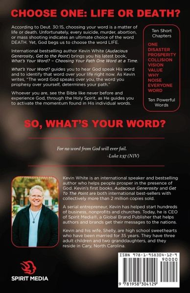 CHOOSE ONE: LIFE OR DEATH? According to Deut. 30:15, choosing your word is a matter of life or death. Unfortunately, every suicide, murder, abortion, or mass shooting indicates an ultimate choice of the word DEATH. Yet, God begs us to choose the word LIFE. International bestselling author Kevin White (Audacious Generosity, Get to the Point) brings you his latest book, What's Your Word? - Choosing Your Path One Word at a Time. What's Your Word? guides you to hear God speak His word and to identify that word over your life right now. As Kevin writes, "The word God speaks over you, the word you prophesy over yourself, determines your path." Whoever you are, see the Bible like never before and experience God, through the Holy Spirit, as He guides you to activate the momentum found in His individual words.