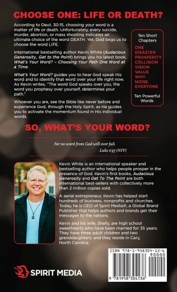 CHOOSE ONE: LIFE OR DEATH? According to Deut. 30:15, choosing your word is a matter of life or death. Unfortunately, every suicide, murder, abortion, or mass shooting indicates an ultimate choice of the word DEATH. Yet, God begs us to choose the word LIFE. International bestselling author Kevin White (Audacious Generosity, Get to the Point) brings you his latest book, What's Your Word? - Choosing Your Path One Word at a Time. What's Your Word? guides you to hear God speak His word and to identify that word over your life right now. As Kevin writes, "The word God speaks over you, the word you prophesy over yourself, determines your path." Whoever you are, see the Bible like never before and experience God, through the Holy Spirit, as He guides you to activate the momentum found in His individual words.