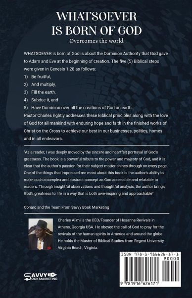 WHATSOEVER IS BORN OF GOD is about the Dominion Authority that God gave to Adam and Eve at the beginning of creation. The five (5) Biblical steps were given in Genesis 1:28 as follows: 1) Be fruitful, 2) And multiply, 3) Fill the earth, 4) Subdue it, and 5) Have Dominion over all the creations of God on earth. Pastor Charles rightly addresses these Biblical principles along with the love of God for all mankind with enduring hope and faith in the finished works of Christ on the Cross to achieve our best in our businesses, politics, homes and in all endeavors.