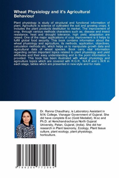 Plant physiology is study of structural and functional information of plant. Agriculture is science of cultivated the soli and growing crops. It includes the plant products destitution to market. The improvement of crop, through various methods characters such as; disease and insect resistance, heat and drought tolerance, high yield, adaptation are raised. One of the major applications of crop improvement is it helps to fulfill global food security. This book contains information about the wheat physiology and agriculture, its methods, application, objectives, calculation methods etc. which helps us to manipulate growth data and agricultural data of wheat species. Book carry vital information regarding certain important topics related to plant physiology and yield attributes and their easy understanding and to the point information is provided. This book has been illustrated with wheat physiology and agriculture topics which are covered with R.G.R., N.A.R and L.W.R in each stage,tables which are presented in new style and for mate.