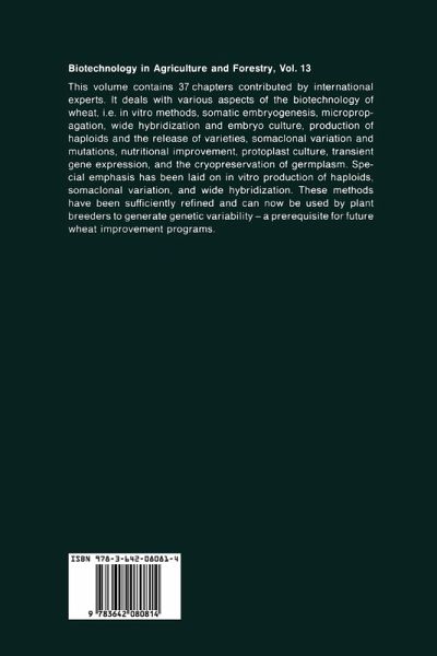 Section I In Vitro Technology, Establishment of Cultures, Somatic Embryogenesis, and Micropropagation.- I. 1 Biotechnology in Wheat Breeding.- I. 2 Factors Affecting the Establishment of Callus Cultures in Wheat.- I. 3 Somatic Embryogenesis in Wheat.- I. 4 Factors Affecting Somatic Embryogenesis in Wheat.- I. 5 Improvement of Somatic Embryogenesis in Wheat by Segmentation of Cultured Embryos.- I. 6 Clonal Propagation of Wheat.- Section II Wide Hybridization: Embryo, Ovule and Panicle Culture.- II. 1 Wide Hybridization - Potential of Alien Genetic Transfers for Triticum aestivum Improvement.- II. 2 Incorporation of Barley Chromosomes into Wheat.- II. 3 Triticum × Aegilops Hybrids Through Embryo Culture.- II. 4 Wheat × Thinopyrum Hybrids.- II. 5 Production of Triticale (Triticum × Secale) Through Embryo Culture.- II. 6 Triticale × Wheat Hybrids.- II. 7 Embryo Culture of Wheat - Regenerative Tissue Culture System.- II. 8 In Vitro Culture of Wheat Ovules.- II. 9 Growth of Wheat Ears in Liquid Culture.- Section III In Vitro Production of Haploids and Release of Varieties.- III. 1 Wheat Anther Culture: Agronomic Performance of Doubled Haploid Lines and the Release of a New Variety "Florin".- III. 2 Anther Culture 28 - A New Disease-Resistant and High-Yielding Variety of Winter Wheat.- III. 3 In Vitro Production of Haploids in Triticum spelta.- III. 4 In Vitro Production of Haploids in Triticale.- III. 5 Wheat Anther Culture: Effect of Temperature.- III. 6 Wheat Anther Culture Using Liquid Media.- III. 7 A Direct-Generation System for Wheat Haploid Production.- III. 8 Culture of Isolated Pollen of Wheat (Triticum aestivum L.).- III. 9 Wheat Haploids Through the Bulbosum Technique.- III. 10 Wheat Haploids Through the Salmon Method.- Section IV Somaclonal andGametoclonal Variation, and Mutation.- IV. 1 Chromosome Instability in Bread Wheat (Triticum aestivum) Cell Suspensions and Their Dividing Protoplasts.- IV. 2 Somaclonal Variation in Durum Wheat (Triticum durum Desf.).- IV. 3 Somaclonal Variation in Triticale.- IV. 4 Genetics of Gliadin Proteins and the Problems of Interpreting Results Obtained with Somaclonal Variation in Wheat.- IV. 5 Gametic Analysis and Gametoclonal Variation in Triticeae.- IV. 6 Mutations in Wheat - Future Possibilities.- IV. 7 Streptomycin Resistance of Common Wheat at Plant and Cellular Level.- Section V Nutritional Improvement.- V. 1 High Protein Wheat.- V. 2 Biotechnology in Nutritional Improvement of Wheat.- Section VI Protoplasts, Transient Gene Expression, and Cryopreservation.- VI. 1 Ion Channels in Wheat Protoplasts: Patch-Clamp Application to the Study of Transport.- VI. 2 Transient Gene Expression in Wheat (Triticum aestivum) Protoplasts.- VI. 3 Cryopreservation of Germplasm of Wheat.