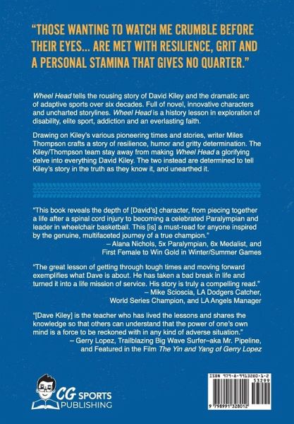 Wheel Head tells the rousing story of David Kiley and the dramatic arc of adaptive sports over six-decades. Full of novel, innovative characters and uncharted storylines, Wheel Head is a history lesson in exploration of disability, elite sport, addiction and an everlasting faith. Drawing on Kiley's various pioneering times and stories, writer Miles Thompson crafts a story of resilience, humor and gritty determination. The Kiley/Thompson team stay away from making Wheel Head a glorifying delve into everything David Kiley. The two instead are determined to tell Kiley's story in the truth as they know it and unearthed it. [Dave Kiley] is the teacher who has lived the lessons and shares the knowledge so that others can understand that the power of one's own mind is a force to be reckoned with in any kind of adverse situation. - Gerry Lopez, Trailblazing Big Wave Surfer-aka Mr. Pipeline, and Featured in the Film, The Yin and Yang of Gerry Lopez Dave Kiley is a true American success story. In my life I've had the privilege of meeting hundreds of influential people. Dave is at the top of the list! His contribution to men, women and children with disabilities has been endless. Dave's 'no limits"' attitude has allowed him to build innovative adaptive sport programs across the country... not to mention his gold medals in THREE sports! The great lesson of getting through tough times and moving forward exemplifies what Dave is about. He has taken a bad break in life and turned it into a life mission of service. His selfless example is truly inspirational! His story is truly a compelling read. The honor of knowing Dave for over 40 years has been a tremendous gift in my life. I hope people who get to hear his journey feel the same gift! - Mike Scioscia, LA Dodgers Catcher, World Series Champion; LA Angels Manager, World Series Champion David Kiley's story is not just about overcoming adversity, but about transforming it into triumph, leadership and a big give-back. Wheel Head captures the essence of an indomitable spirit who has left an indelible mark on the world of Paralympic sports. - Alana Nichols, 5x Paralympian, 6x Medalist, and First Female to Win Gold in Winter/Summer Games