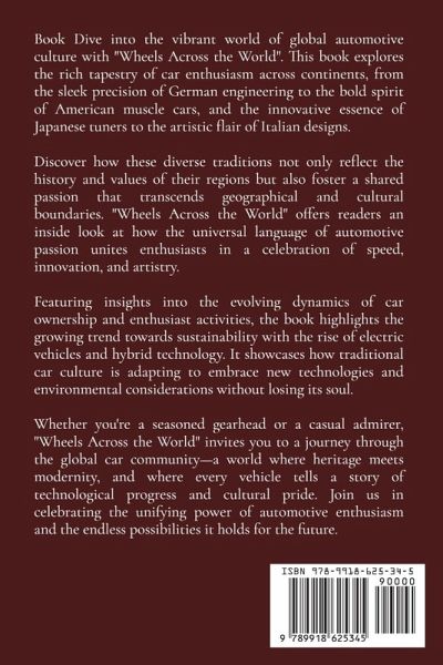 Dive into the vibrant world of global automotive culture with "Wheels Across the World". This book explores the rich tapestry of car enthusiasm across continents, from the sleek precision of German engineering to the bold spirit of American muscle cars, and the innovative essence of Japanese tuners to the artistic flair of Italian designs. Discover how these diverse traditions not only reflect the history and values of their regions but also foster a shared passion that transcends geographical and cultural boundaries. "Wheels Across the World" offers readers an inside look at how the universal language of automotive passion unites enthusiasts in a celebration of speed, innovation, and artistry. Featuring insights into the evolving dynamics of car ownership and enthusiast activities, the book highlights the growing trend towards sustainability with the rise of electric vehicles and hybrid technology. It showcases how traditional car culture is adapting to embrace new technologies and environmental considerations without losing its soul. Whether you're a seasoned gearhead or a casual admirer, "Wheels Across the World" invites you to a journey through the global car community-a world where heritage meets modernity, and where every vehicle tells a story of technological progress and cultural pride. Join us in celebrating the unifying power of automotive enthusiasm and the endless possibilities it holds for the future.