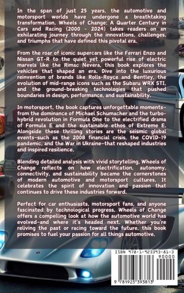In the span of just 25 years, the automotive and motorsport worlds have undergone a breathtaking transformation. Wheels of Change: A Quarter Century in Cars and Racing (2000 - 2024) takes readers on an exhilarating journey through the innovations, challenges, and triumphs that have defined this pivotal era. From the roar of iconic supercars like the Ferrari Enzo and Nissan GT-R to the quiet yet powerful rise of electric marvels like the Rimac Nevera, this book explores the vehicles that shaped an era. Dive into the luxurious reinvention of brands like Rolls-Royce and Bentley, the evolution of mid-range icons such as the Subaru WRX STI, and the ground-breaking technologies that pushed boundaries in design, performance, and sustainability. In motorsport, the book captures unforgettable moments-from the dominance of Michael Schumacher and the turbo-hybrid revolution in Formula One to the electrified drama of Formula E and the sustainable ethos of Extreme E. Alongside these thrilling stories are the seismic global events-such as the 2008 financial crisis, the COVID-19 pandemic, and the War in Ukraine-that reshaped industries and inspired resilience. Blending detailed analysis with vivid storytelling, Wheels of Change reflects on how electrification, autonomy, connectivity, and sustainability became the cornerstones of modern automotive and motorsport cultures. It celebrates the spirit of innovation and passion that continues to drive these industries forward. Perfect for car enthusiasts, motorsport fans, and anyone fascinated by technological progress, Wheels of Change offers a compelling look at how the automotive world has evolved-and where it's headed next. Whether you're reliving the past or racing toward the future, this book promises to fuel your passion for all things automotive.
