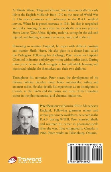In Wheels, Waves, Wings and Drums, Peter Beatson recalls his early life in the English Midlands from 1919 to the onset of World War II. His story continues with enlistment in the R.A.F. medical service. When he is posted overseas in 1941, his ship is torpedoed and sinks. Among the survivors, he spends the next two years in Sierra Leone, West Africa, fi ghting malaria, caring for the sick and injured, and finding adventure on water, land, and in the air. Returning to wartime England, he copes with diffi cult postings and marries Sheila Hurst. He also plays in a dance band called the Pathogens. Following his discharge, Peter works for Imperial Chemical Industries and plays part-time with another band. During those years, he and Sheila struggle to find affordable housing and motorized vehicles for themselves and their two children. Throughout his narrative, Peter traces the development of his lifelong hobbies: bicycles, motor bikes, automobiles, sailing and amateur radio. He also details his experiences as an immigrant to Canada in the 1960s and the twists and turns of his Canadian career in the pharmaceutical and chemical industries.