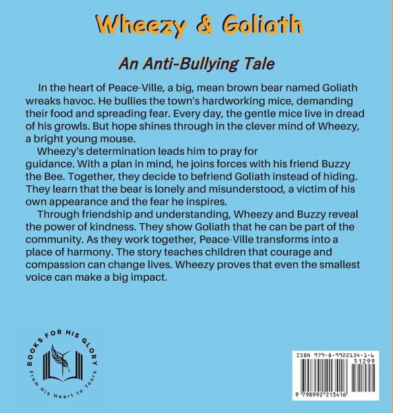 In the heart of Peace-Ville, a big, mean brown bear named Goliath wreaks havoc. He bullies the town's hardworking mice, demanding their food and spreading fear. Every day, the gentle mice live in dread of his growls. But hope shines through in the clever mind of Wheezy, a bright young mouse. Wheezy's determination leads him to pray for guidance. With a plan in mind, he joins forces with his friend Buzzy the Bee. Together, they decide to befriend Goliath instead of hiding. They learn that the bear is lonely and misunderstood, a victim of his own appearance and the fear he inspires. Through friendship and understanding, Wheezy and Buzzy reveal the power of kindness. They show Goliath that he can be part of the community. As they work together, Peace-Ville transforms into a place of harmony. The story teaches children that courage and compassion can change lives. Wheezy proves that even the smallest voice can make a big impact.