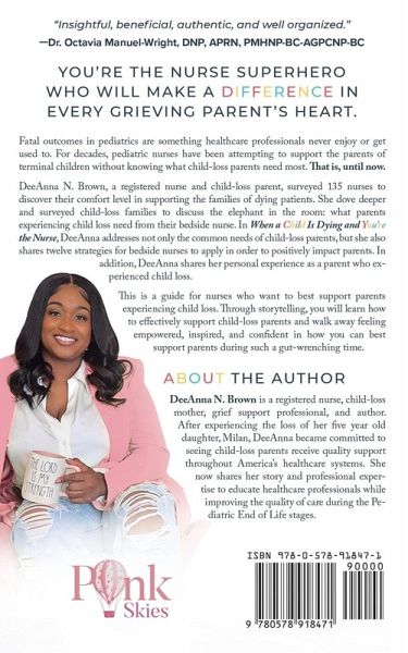 Fatal outcomes in pediatrics are something healthcare professionals never enjoy or get used to. For decades, pediatric nurses have been attempting to support the parents of terminal children without knowing what child-loss parents need most. That is, until now. DeeAnna N. Brown, a registered nurse and child-loss parent, surveyed 135 nurses to discover their comfort level in supporting the families of dying patients. She dove deeper and surveyed child-loss families to discuss the elephant in the room: what parents experiencing child loss need from their bedside nurse. In When a Child Is Dying and You're the Nurse, DeeAnna addresses not only the common needs of child-loss parents, but she also shares twelve strategies for bedside nurses to apply in order to positively impact parents. In addition, DeeAnna shares her personal experience as a parent who ex-perienced child loss. This is a guide for nurses who want to best support parents experiencing child loss. Through storytelling, you will learn how to effectively support child-loss parents and walk away feeling empowered, inspire, and confident in how you can best support parents during such a gut-wrenching time.