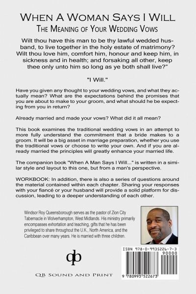 Have you ever thought about the meaning of the vows you are about to make to each other? Or have you already made them but never really understood the power of what you said? Well it's time to see your wedding vows as you have probably never seen them before. In this book we examine the wedding vows that are made before God at the sacred altar. We explore their meaning, and how a bride can carry out her promises to fulfil her groom's needs as well as her own. This book is based on the traditional vows exchanged during an English wedding ceremony, but the principles extend far beyond. Even if you write your own vows the principles are the same - marriage is a lifelong commitment. The book is aimed not only at those preparing for marriage, but also is a great guide for those who have been married for a few years or for many. Find out: - the real power that lies behind the words "I Will" - what each of the individual promises mean for your daily life - how to overcome the challenges you will face to maintaining your vows At the end of the book are a series of questions to be used as a basis for discussion and bonding with your fiancé or husband. The related title 'When A Man Says I Will' is written in a similar style and layout. Some of the content is the same but much of it is written for a male reader.