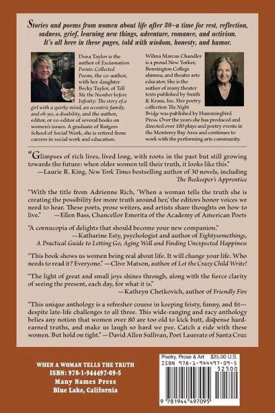 Women over 80 have done and are doing important, beautiful, and amazing things. The idea for this book came about as friends sat around talking about what it meant to be turning 80, wondering what other women felt, what their lives were like. A couple of us had the idea of collecting accounts and putting together a book. So off went calls for submissions in various literary sources, and we were amazed at the response. Women in their 80s and 90s from all over the country and abroad sent us stories about their joys, sorrows, adventures, love lives, losses, memories, and their aches and pains. There was sadness. There was humor. There was advice. There was so much! And we received artwork as well, some of which is included. The title, When A Woman Tells the Truth, is part of a quote by the writer Adrienne Rich. The full sentence is "When a woman tells the truth she is creating the possibility for more truth around her." It is in her landmark book On Lies, Secrets, and Silence, published by W.W. Norton & Co., 1979.