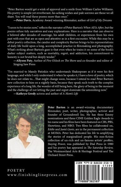 "Peter Barton would get a wink of approval and a smile from William Carlos Williams. His poetry is simple yet reverberant, his aching wishes and pale sorrows are those we all share. You will read these poems more than once."-Peter Davis, Academy Award winning filmmaker, author of Girl of My Dreams "I seem to be stories now," reflects the narrator of Peter Barton's When All Is After, but the poems refuse tidy narratives and easy explanations. Here is a narrator that can observe a beloved after decades of marriage, his adult children, or experiences from his own past with eyes that are as open and attentive as in a first encounter. While this may be a debut poetry collection, the candor and complexity Barton brings to his representations of daily life build upon a long, accomplished practice in filmmaking and photography. What's striking about Barton's gaze is that even when he trains it on some of the book's darker subject matters, such as mortality, regret, and addiction, his commitment to honesty is not brutal but deeply tender."-Allyson Paty, Author of Five O'clock on The Shore and co-founder and editor of Singing Saw Press "I'm married to Mandy Patinkin who understands Shakespeare as if it were his first language, and while I only understand it when he speaks it, I have a love of poetry, which he does not relate to...That might change soon, because I intend to read Peter Barton's new collection to him on a nightly basis, because they speak such truth to the complex experience of a long life, the wonder of still being here, the glory of being in the moment and the challenge of not letting the past and regret dominate the astonishing now."-Kathryn Grody actress and author of A Mom's Life