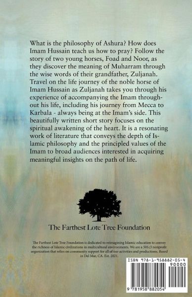 What is the philosophy of Ashura? How does Imam Hussain teach us how to pray? Follow the story of two young horses, Foad and Noor, as they discover the meaning of Muharram through the wise words of their grandfather, Zuljanah. Travel on the life journey of the noble horse of Imam Hussain as Zuljanah takes you through his experience of accompanying the Imam throughout his life, including his journey from Mecca to Karbala - always being at the Imam's side. This beautifully written short story focuses on the spiritual awakening of the heart. It is a resonating work of literature that conveys the depth of Islamic philosophy and the principled values of the Imam to broad audiences interested in acquiring meaningful insights on the path of life. The story was specially selected and presented at Harvard University prior to publication.