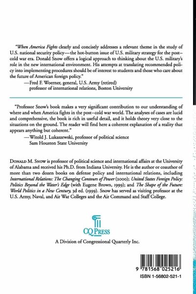 When, where, how, and to what end American force will be applied in this new century is a matter of intense debate and controversy. When America Fights takes a hard look at the United States' military involvement in the post-cold war era, especially a growing number of peacekeeping operations. Are U.S. national interests served by this deployment of forces abroad? What types of forces are needed and when should they be employed? At what point can we proclaim &BAD:quot;mission accomplished&BAD:quot; and withdraw?Snow uses the deployment in Kosovo as a primary example, but refers back to the role of U.S. troops in Bosnia, Somalia, Haiti, and Iraq, extrapolating from those operations in an effort to theorize about the future uses of military force. Snow looks at the likely future patterns of violence-paramilitary activities, terrorism, and internal wars-and then suggest the direction policy might take and the difficulties associated with the difference objectives, thereby framing the alternatives in a way that fosters classroom debate and discussion.