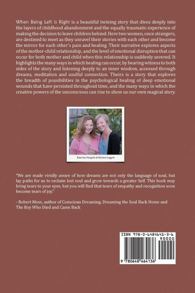 When Being Left is Right is a beautiful twining story that dives deeply into the layers of childhood abandonment and the equally traumatic experience of making the decision to leave children behind. Here two women, once strangers, are destined to meet as they unravel their stories with each other and become the mirror for each other’s pain and healing. Their narrative explores aspects of the mother-child relationship, and the level of emotional disruption that can occur for both mother and child when this relationship is suddenly severed. It highlights the many ways in which healing can occur, by bearing witness to both sides of the story and listening deeply to an inner wisdom, accessed through dreams, meditation and soulful connection. Theirs is a story that explores the breadth of possibilities in the psychological healing of deep emotional wounds that have persisted throughout time, and the many ways in which the creative powers of the unconscious can rise to show us our own magical story.