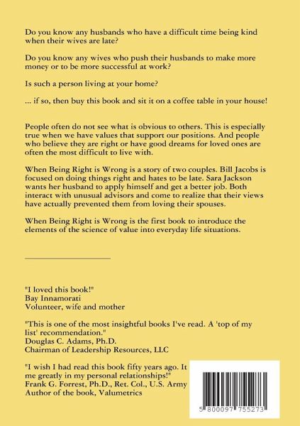An inciteful story of two marriage relationships where one of the spouses has ideals and dreams that prevent love. This is the book for wives who live with husbands who fixate on being on time and who "just don't get it." When Being Right is Wrong is "the best way to get my stubborn husband to understand what I've been trying to tell him our entire marriage!" This is also the best book for husbands whose wives are always trying to change them and don't understand what dangerous territory they are tredding into. Through the two intertwined stories readers see and understand that what they are doing is not loving. Husbands and wives will be able to "see" what they are doing through the lives of the characters in the book. This is the first book that applies the elements of the science of value to relationships and is the easiest way for a person to learn and apply these basic elements by seeing them used and clarified in the context of this pair of love stories.