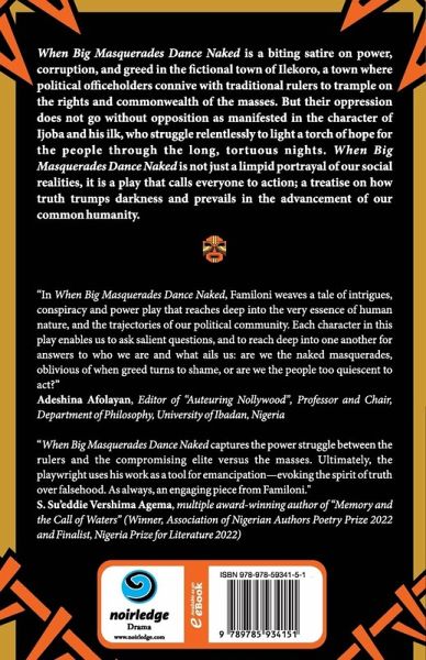 When Big Masquerades Dance Naked is a biting satire on power, corruption, and greed in the fictional town of Ilekoro, a town where political officeholders connive with traditional rulers to trample on the rights and commonwealth of the masses. But their oppression does not go without opposition as manifested in the character of Ijoba and his ilk, who struggle relentlessly to light a torch of hope for the people through the long, tortuous nights. When Big Masquerades Dance Naked is not just a limpid portrayal of our social realities, it is a play that calls everyone to action; a treatise on how truth trumps darkness and prevails in the advancement of our common humanity. "In When Big Masquerades Dance Naked, Familoni weaves a tale of intrigues, conspiracy and power play that reaches deep into the very essence of human nature, and the trajectories of our political community. Each character in this play enables us to ask salient questions, and to reach deep into one another for answers to who we are and what ails us: are we the naked masquerades, oblivious of when greed turns to shame, or are we the people too quiescent to act?" -Adeshina Afolayan, Editor of "Auteuring Nollywood", Professor and Chair, Department of Philosophy, University of Ibadan, Nigeria "When Big Masquerades Dance Naked captures the power struggle between the rulers and the compromising elite versus the masses. Ultimately, the playwright uses his work as a tool for emancipation- evoking the spirit of truth over falsehood. As always, an engaging piece from Familoni." -S. Sueddie Vershima Agema, multiple award-winning author of "Memory and the Call of Waters" (Winner, Association of Nigerian Authors Poetry Prize 2022 and Finalist, Nigeria Prize for Literature 2022)